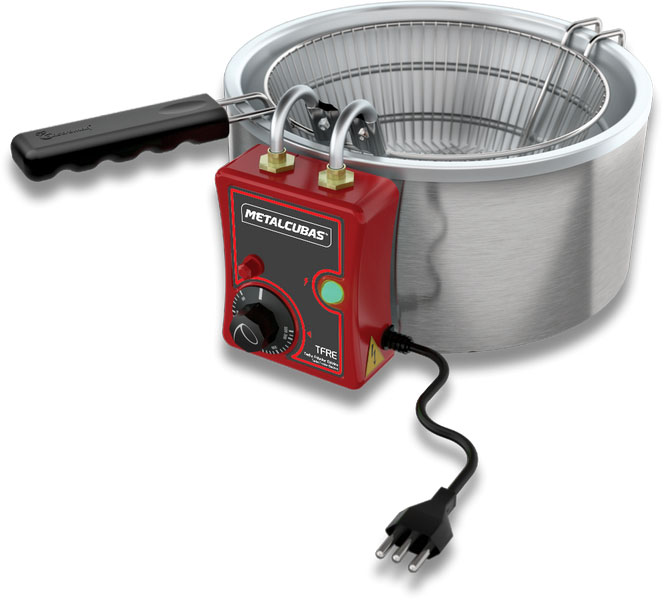 Freidora eléctrica Metalcubas TFRE-7 tiene una capacidad de 7 litros, estructura de chapa de acero inoxidable, termostato para control de la temperatura con cesta incluida.