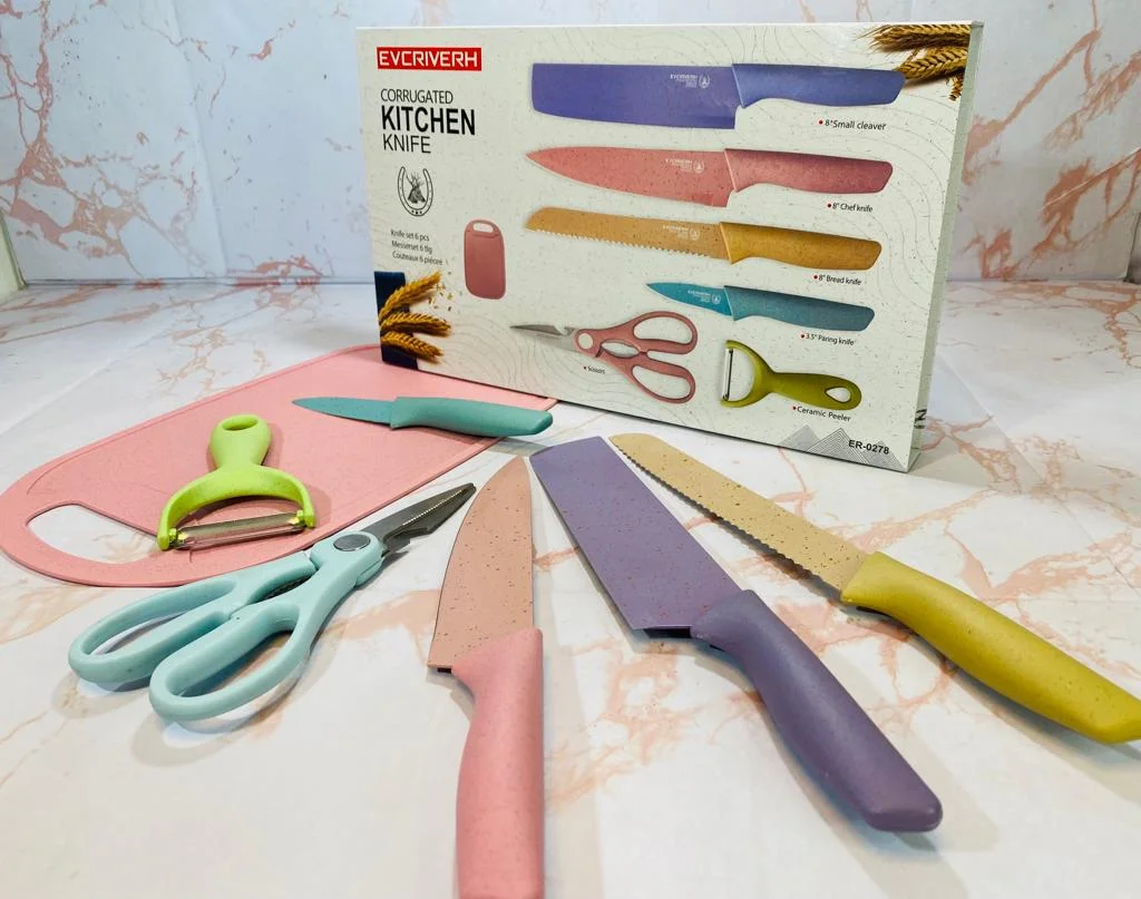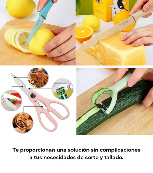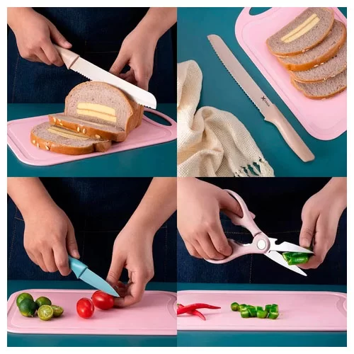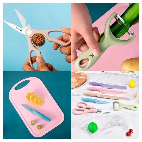 El juego de cuchillos de cocina es ampliamente utilizado para cortar, rebanar y picar carne, pescado, queso, pan, verduras y frutas. Las tijeras se pueden utilizar como abrebotellas y cascanueces.