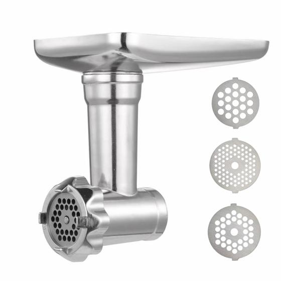 - Accesorios incluidos: 3 discos/cuchillas de corte (fina 3mm, media 5mm, gruesa 7mm), accesorios para hacer embutidos (salchicha y kubbe), empujador de alimentos.