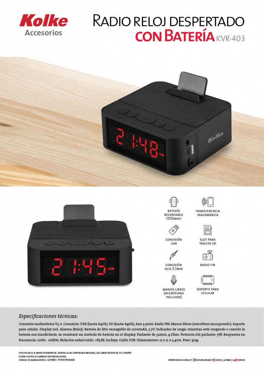 - Conexión: USB (hasta 64Gb), SD (hasta 64Gb), Aux 3.5mm.